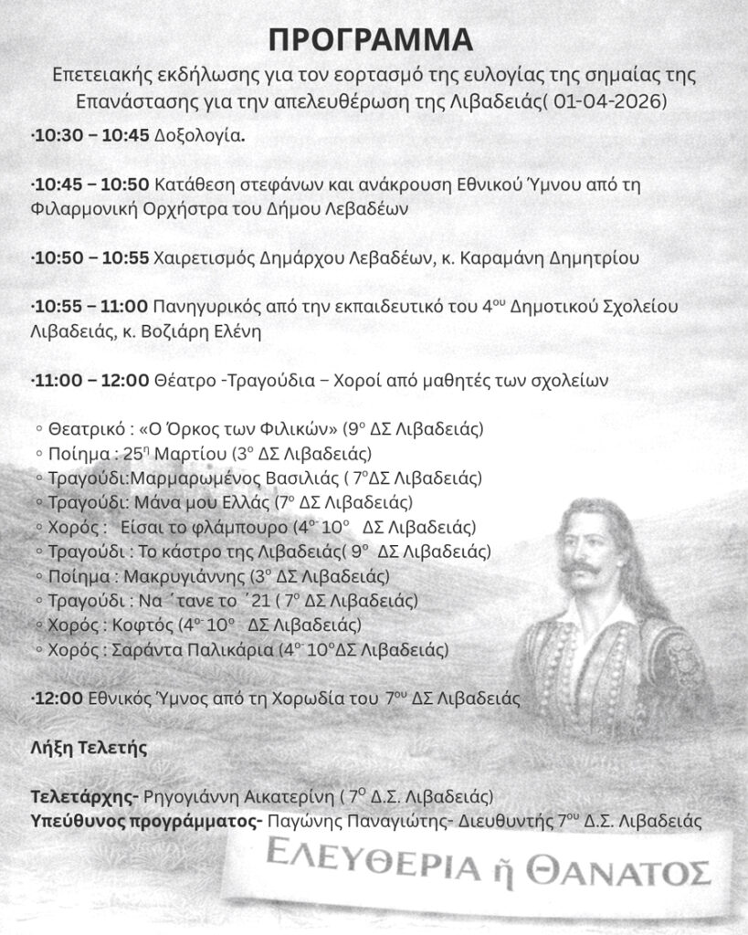 Ο Δήμος Λεβαδέων συνδιοργανώνει επετειακή εκδήλωση, με τον Μορφωτικό Σύλλογο Λεβαδείας, το Εκκλησιαστικό Συμβούλιο του Ι.Ν. Αγίας Παρασκευής, το 7ο Δημοτικό Σχολείο και άλλα σχολεία της πόλης, με αφορμή τον εορτασμό της ευλογίας της σημαίας της Επανάστασης για την απελευθέρωση της Λιβαδειάς από τον οθωμανικό ζυγό.