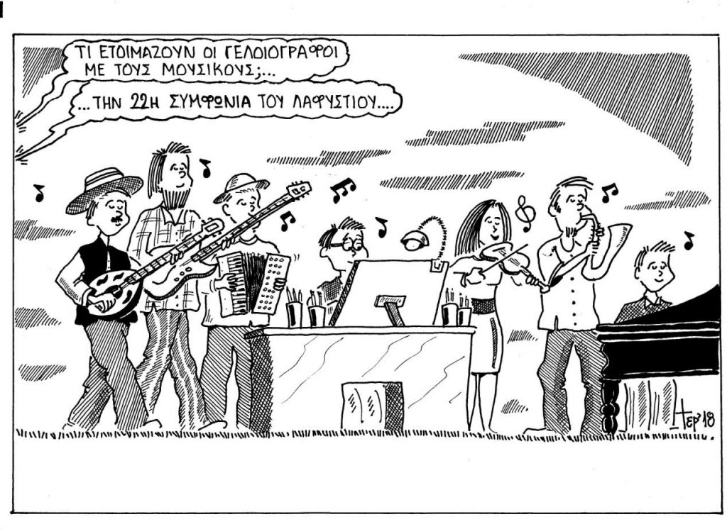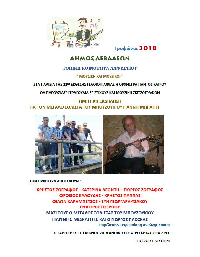 Η 22η Έκθεση Γελοιογραφίας με θέμα “Μουσική και Μουσικοί” θα παρουσιαστεί, στο πλαίσιο των Τροφωνίων, στο ισόγειο του Νερόμυλου από 19 – 25 Σεπτεμβρίου 2018. Ώρες λειτουργίας της έκθεσης: 19:00 – 22:00