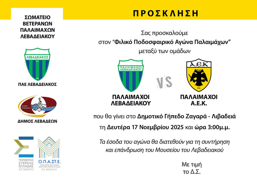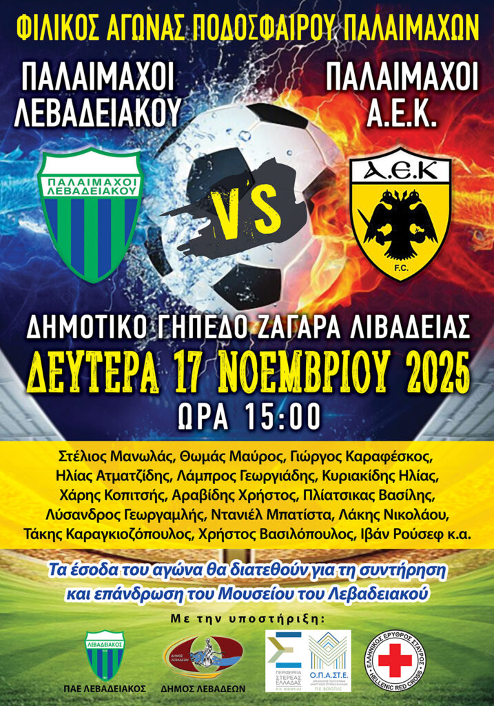 Φιλικός ποδοσφαιρικός αγώνας παλαιμάχων μεταξύ των ομάδων Λεβαδειακού – ΑΕΚ, θα πραγματοποιηθεί στο δημοτικό γήπεδο του Ζαγαρά, τη Δευτέρα 17 Νοεμβρίου, στις 3 το μεσημέρι.