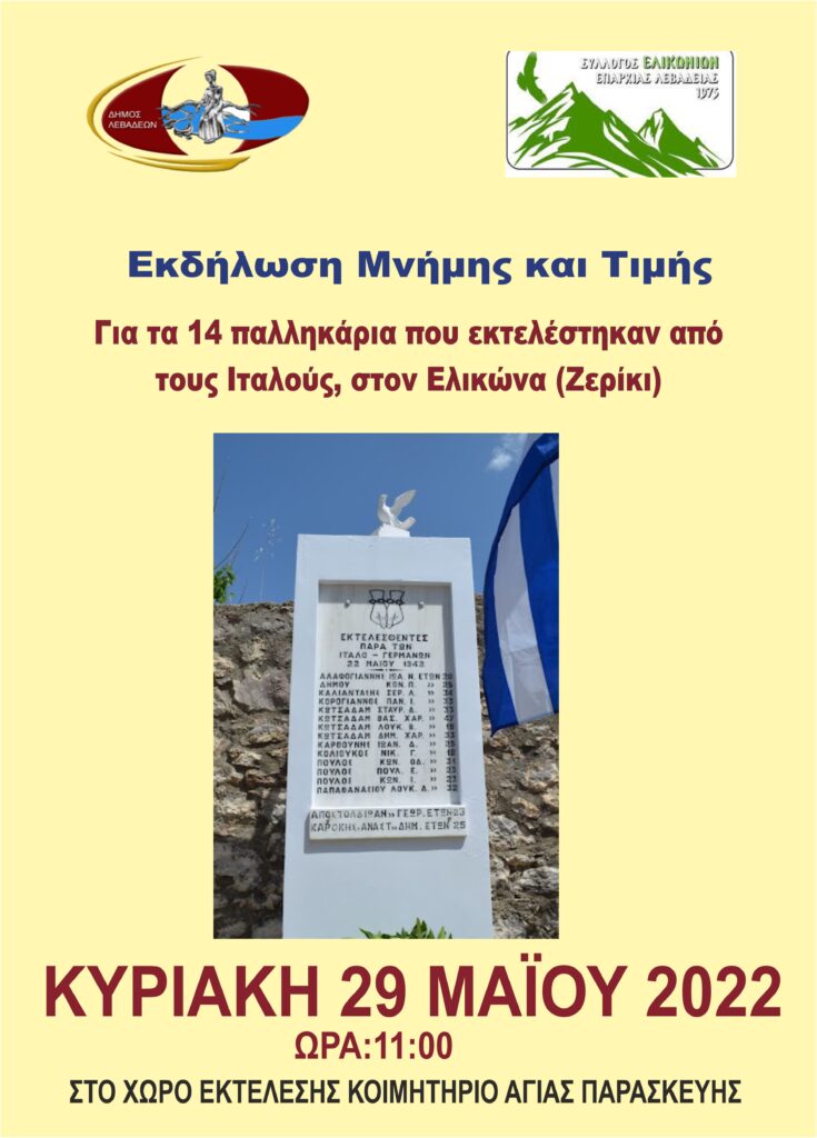Την ερχόμενη Κυριακή θα πραγματοποιηθεί, στο Ζερίκι η εκδήλωση μνήμης για τα 14 παλληκάρια που εκτελέστηκαν από τα Ιταλικά στρατεύματα κατοχής στις 25 Μαίου του 1942.