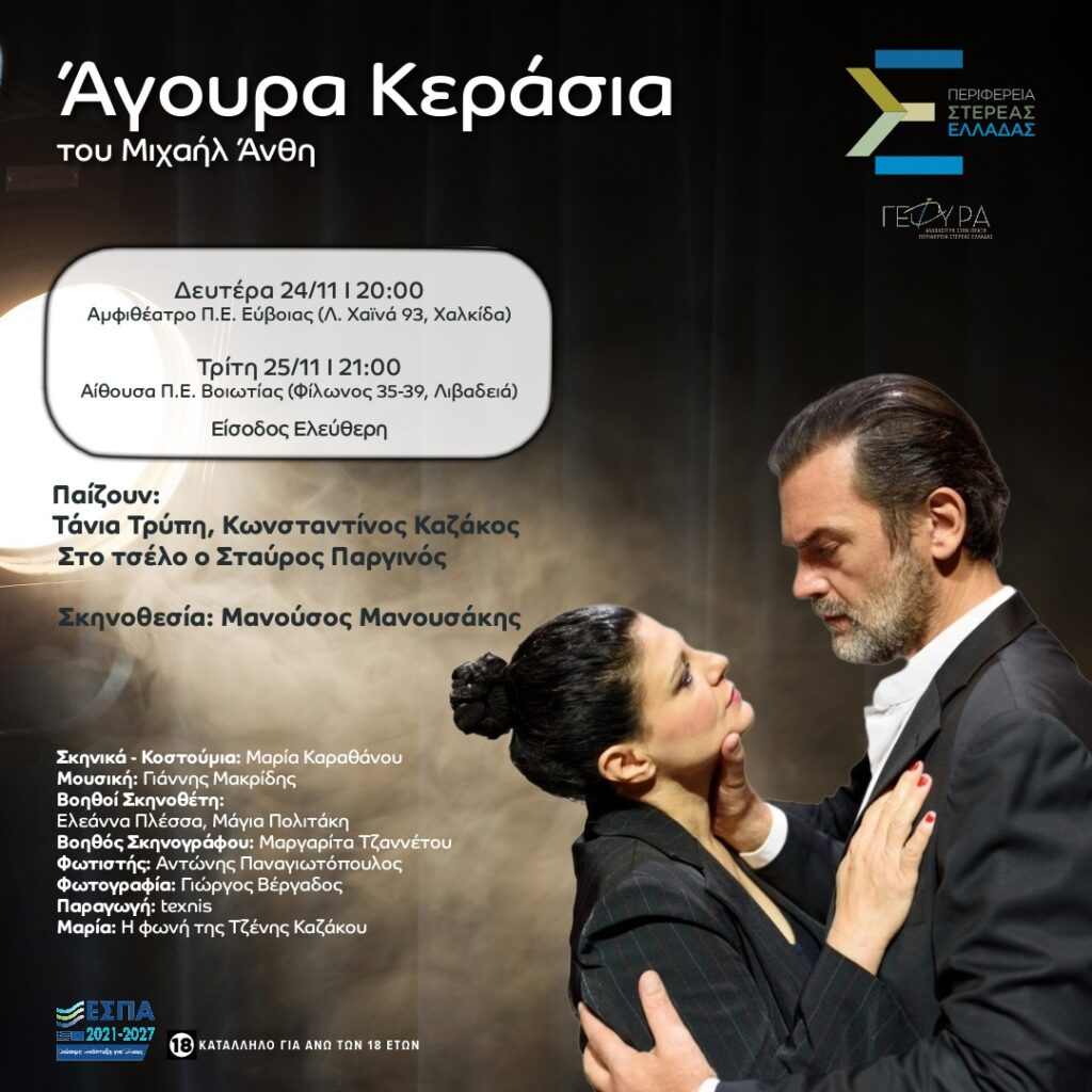 Η Περιφέρεια Στερεάς Ελλάδας σε συνεργασία με το Περιφερειακό Παρατηρητήριο Κοινωνική Ένταξης – Δομή «Γέφυρα» παρουσιάζει το θεατρικό έργο: «Άγουρα Κεράσια» του Μιχαήλ Άνθη, σε σκηνοθεσία Μανούσου Μανουσάκη.