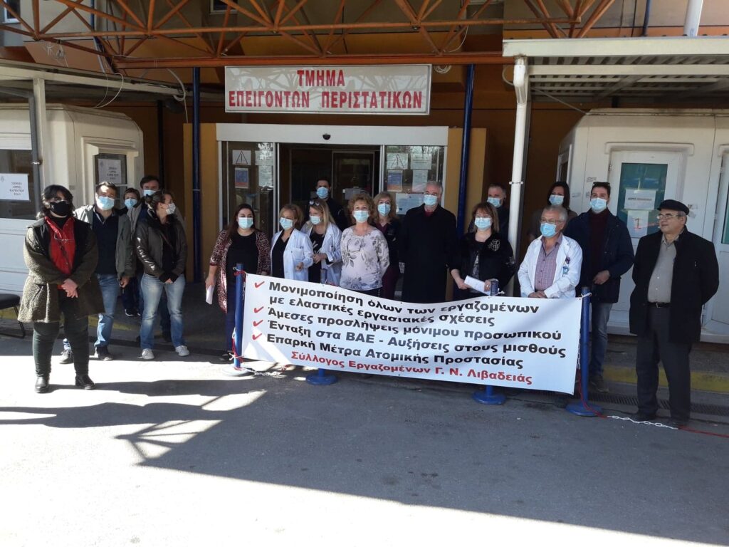 Στο νοσοκομείο Λιβαδειάς, οι εργαζόμενοι, γιατροί και νοσηλευτές, πραγματοποιήσαν στάση εργασίας από τις 11 το πρωί έως τη 1 το μεσημέρι και παράσταση διαμαρτυρίας στην είσοδο του ιδρύματος.