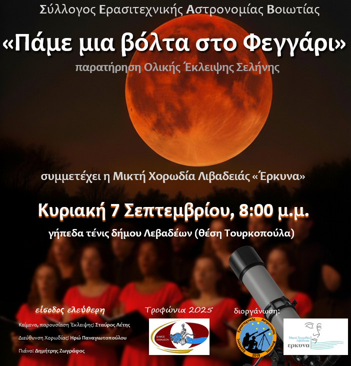 Ο Σύλλογος Ερασιτεχνικής Αστρονομίας Βοιωτίας και η Μικτή Χορωδία Λιβαδειάς «Έρκυνα» στο πλαίσιο των πολιτιστικών εκδηλώσεων “Τροφώνια 2025” του Δήμου Λεβαδέων, διοργανώνουν μία πρωτότυπη εκδήλωση, προσκαλώντας τους λάτρεις του ουρανού και της μουσικής να ζήσουν μία αξέχαστη βραδιά την Κυριακή 7 Σεπτεμβρίου, στη θέση Τουρκοπούλα (στα γηπεδάκια τένις).