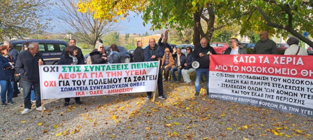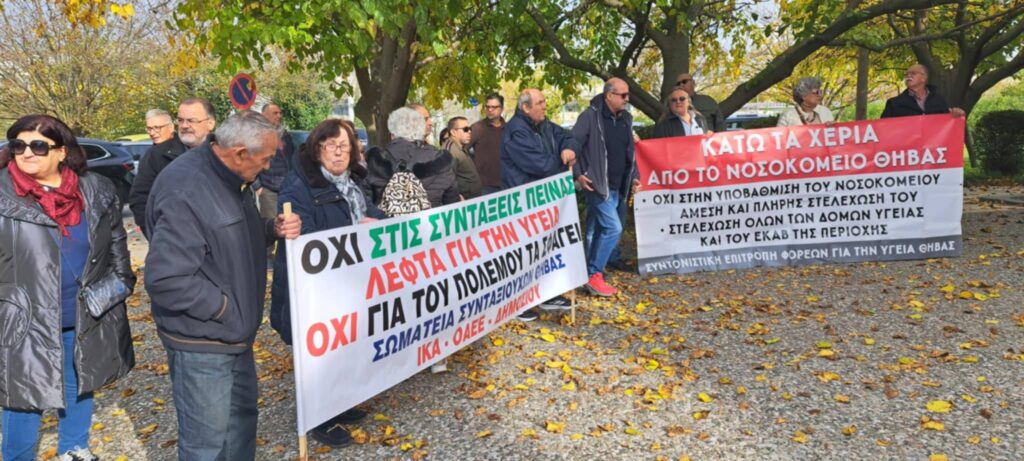 Με λεωφορείο και πανό έφθασαν στην έδρα της ΥΠΕ στη Λάρισα ο πρόεδρος του Ε.Κ Θήβας, Κώστας Καπούλας, εργαζόμενοι του νοσοκομείου, συνταξιούχοι και άλλοι φορείς, με απόντα όμως το Δήμο Θηβαίων.