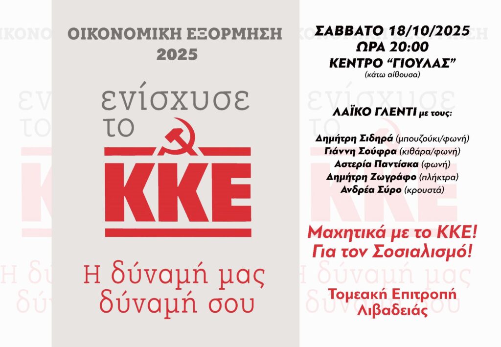 Η Κ.Ο. Λιβαδειάς του ΚΚΕ σας καλεί σε συνεστίαση-λαϊκό γλέντι με τους Δημήτρη Σιδηρά, Γιάννη Σούφρα, Αστερία Παντίσκα, Δημήτρη Ζωγράφο και Ανδρέα Σύρο, το Σάββατο 18 Οκτωβρίου,, ώρα 20:00, στο κέντρο “Γιούλας” (κάτω αίθουσα).