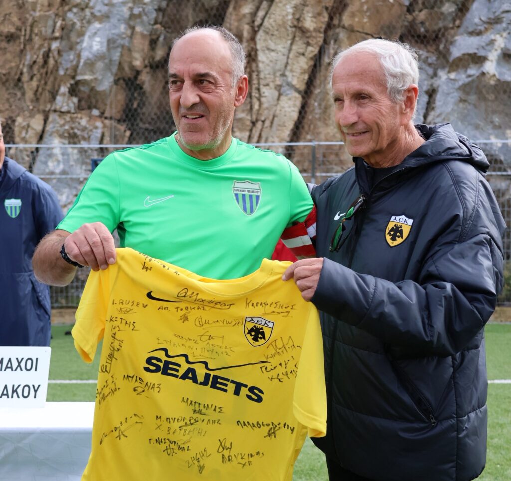 Ξεχωριστή στιγμή ήταν η δωρεά συλλεκτικής φανέλας της ΑΕΚ, υπογεγραμμένης από τους παλαίμαχους, για το Μουσείο του Λεβαδειακού.
