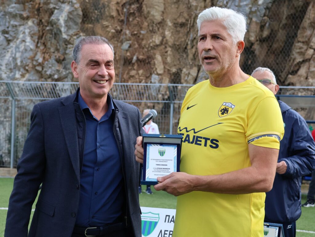 Ο Δήμαρχος Δημήτρης Καραμάνης παρακολούθησε τον αγώνα και τίμησε τον Στέλιο Μανωλά, αναγνωρίζοντας τη μεγάλη του προσφορά στο ελληνικό ποδόσφαιρο.