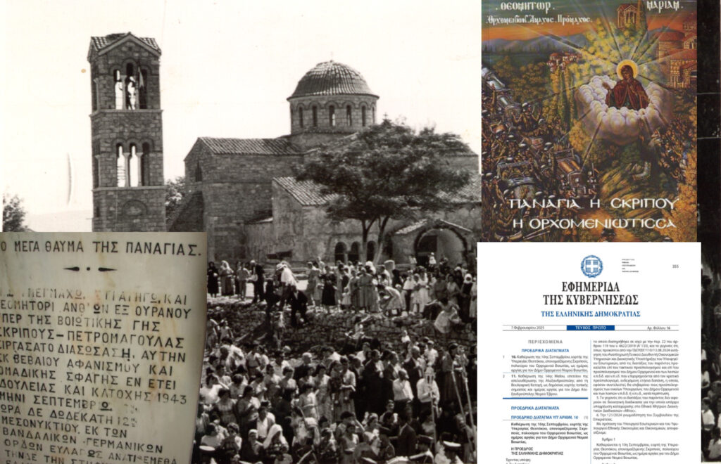 Ο Δήμος Ορχομενού ανακοινώνει ότι με το Προεδρικό Διάταγμα υπ’ αριθμ. 10, το οποίο δημοσιεύθηκε στην Εφημερίδα της Κυβερνήσεως (ΦΕΚ 16/7.2.2025, Τεύχος Α΄), καθιερώνεται η 10η Σεπτεμβρίου, ημέρα εορτής του θαύματος της Υπεραγίας Θεοτόκου, της Παναγίας Σκριπούς και Πολιούχου του Ορχομενού, ως ημέρα τοπικής αργίας για τον Δήμο Ορχομενού.