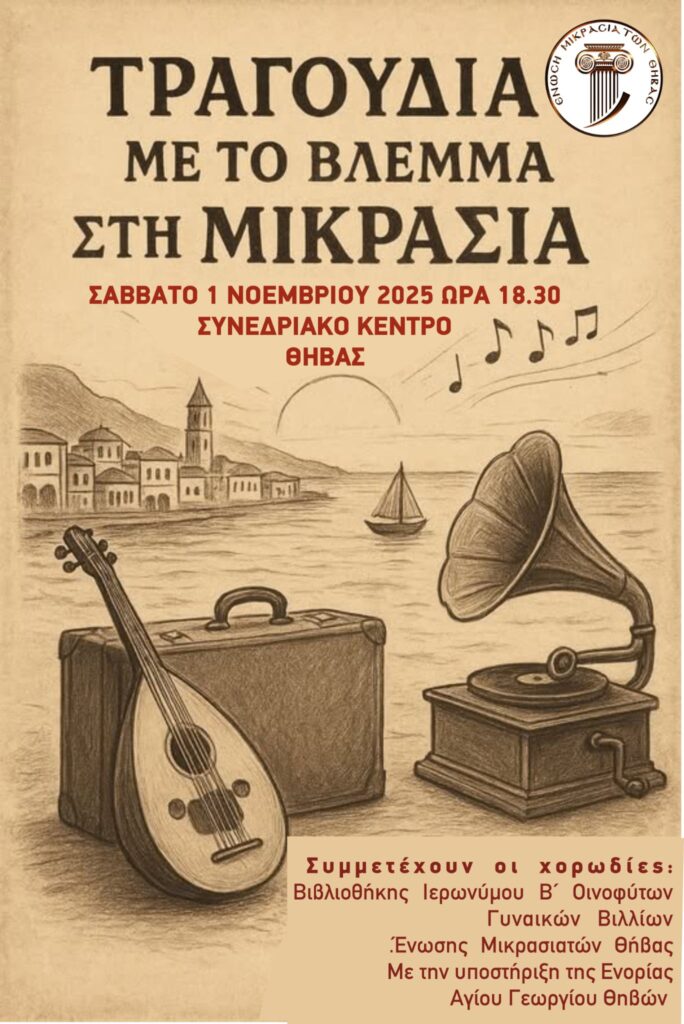 Το Σάββατο 1η Νοεμβρίου και ώρα 6.30 το απόγευμα, στο Συνεδριακό Κέντρο Θήβας, τρεις χορωδίες της περιοχής θα συμμετάσχουν σε ένα μελωδικό αφιέρωμα στη Μικρά Ασία.