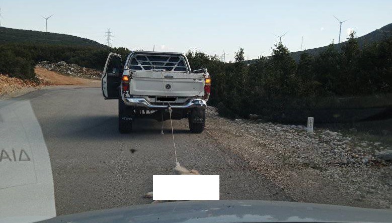 Σοκάρει η εικόνα αγροτικού αυτοκινήτου, να σέρνει στο οδόστρωμα, σκύλο δεμένο με σκοινί από το πόδι, στον πίσω προφυλακτήρα του οχήματος.